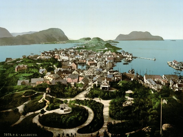Basert på et foto av Ålesund fra mellom 1890 og 1900. Det orginale fotokromet er digitalt restaurert og farge korrigert.